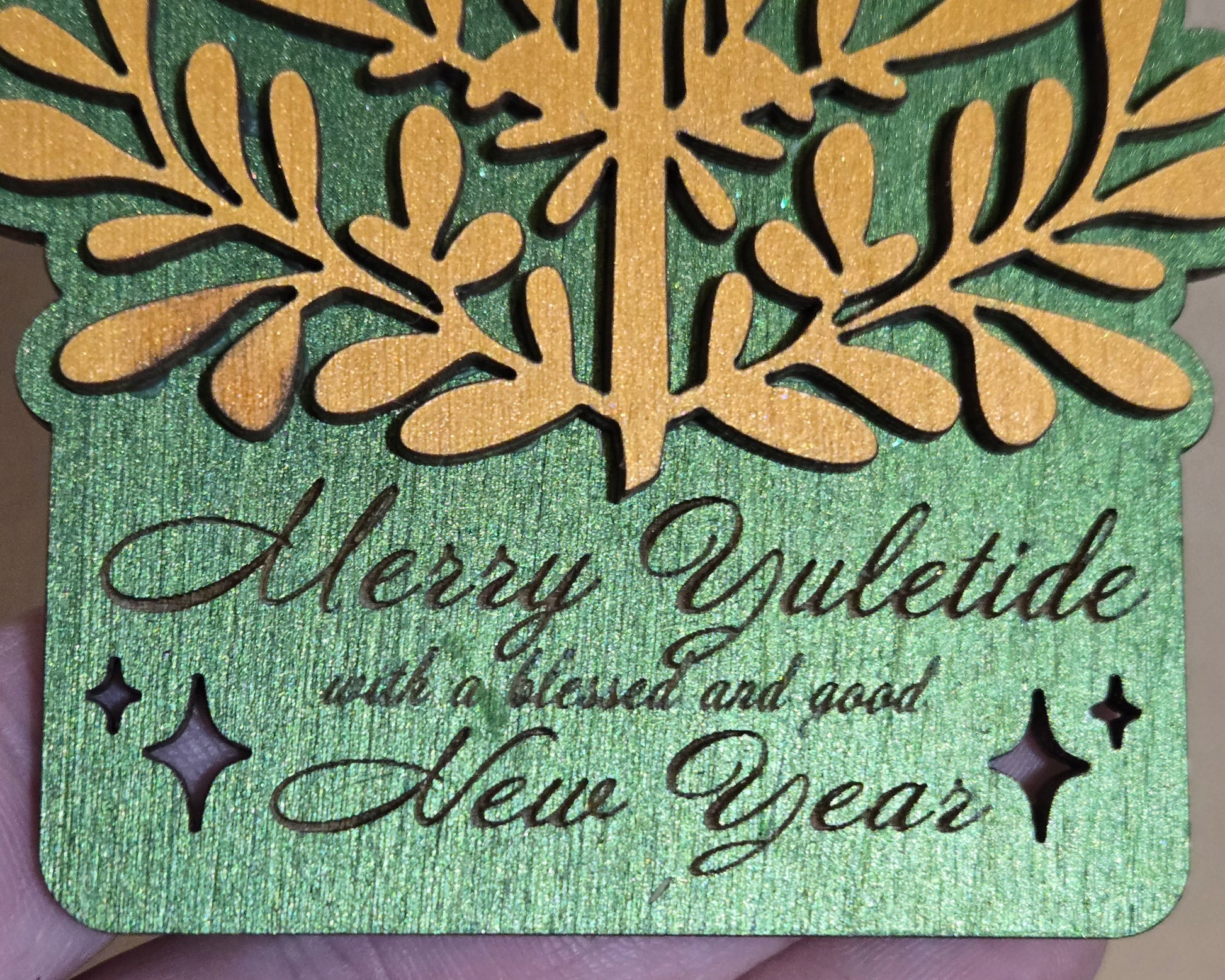 Beautiful layered tree ornament, single-sided - iridescent gold over shimmer green.